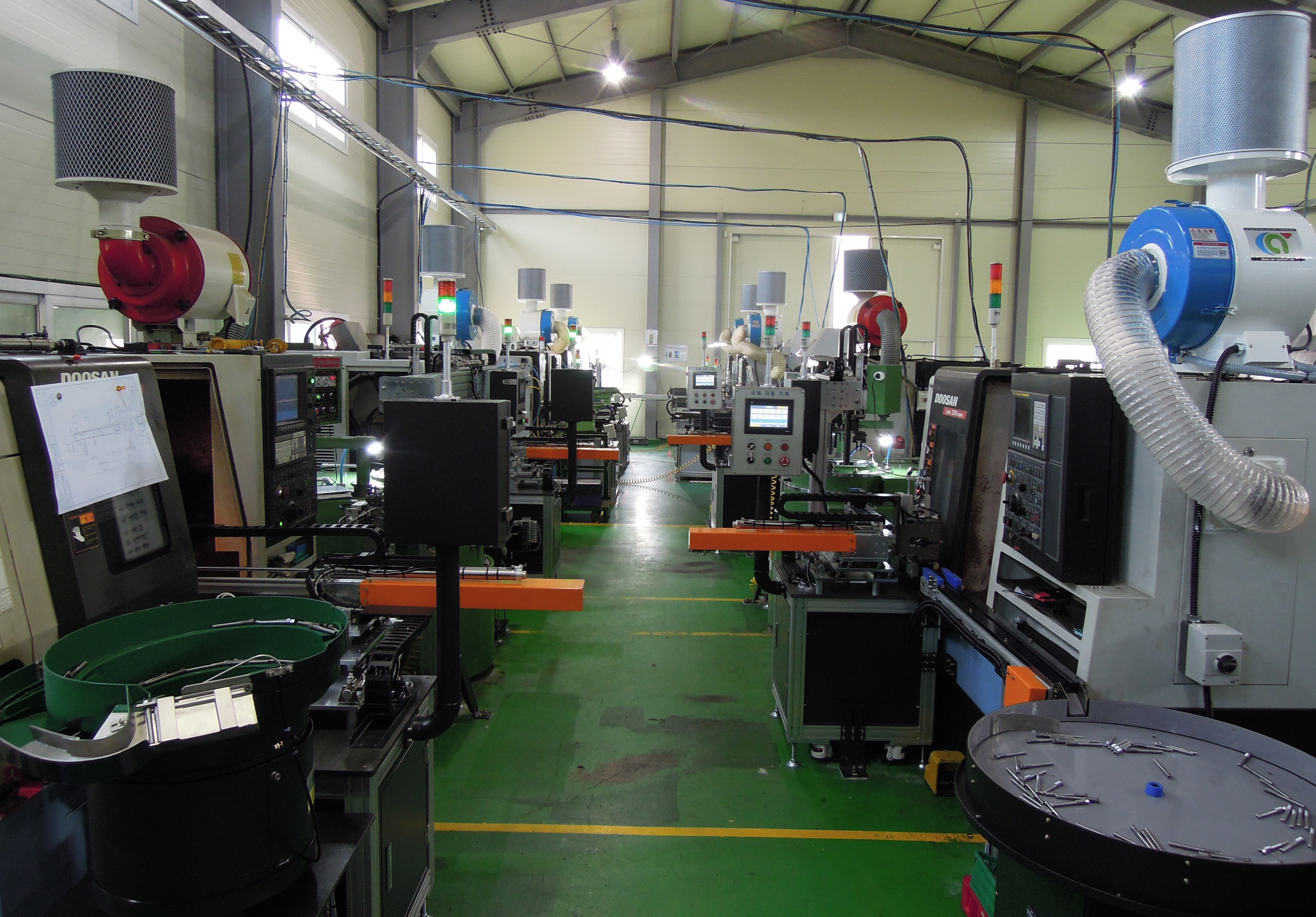 복합공정 자동화라인으로 파츠피더 투입 후 1차 CNC가공,2차 전조나사 가공, 3차 CNC가공하며,